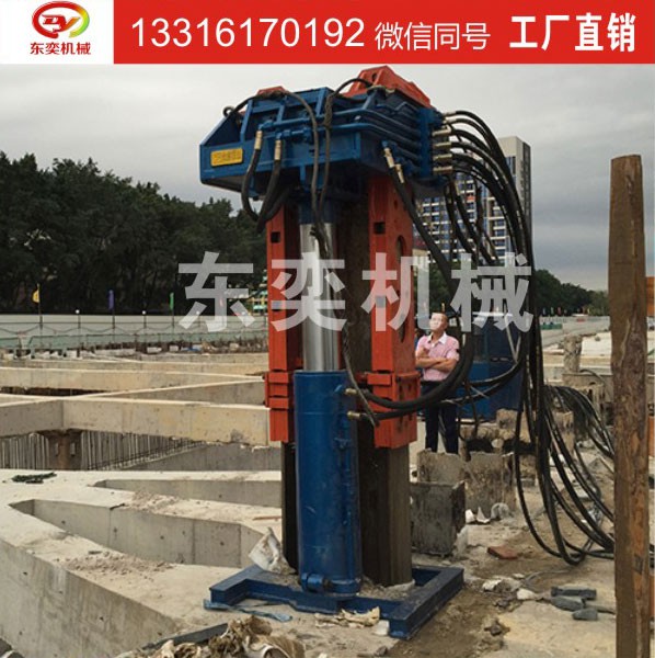 工作原理︰ 工法型鋼拔樁機利用其夾樁器夾住樁頭,液壓缸強制頂壓夾樁器,使之向上頂升一段距離,將樁逐段拔出,適用在粘土、砂土或含少量礫石的土層中拔工字鋼或型鋼樁。